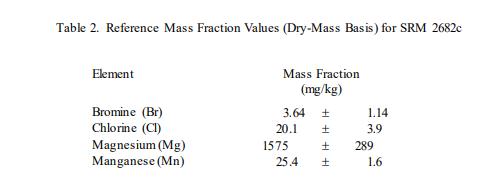 表 2 中提供了溴、氯、鎂和錳的參考值,以基于干質量的質量分數 [1] 表示。參考值是最佳估計值的非認證值的真實價值;但是,該值不符合 NIST 的認證標準,并且提供了相關的不確定性,該不確定性可能僅反映測量精度,可能不包括所有不確定性來源 [2]。