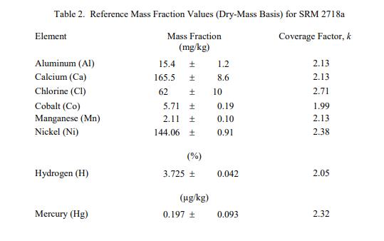 表 2 中提供了鋁、鈣、氯、鈷、氫、汞、錳和鎳的參考值,以基于干質(zhì)量的質(zhì)量分數(shù) [1] 表示。參考值是對真實價值的最佳估計的非核證價值;但是,該值不符合 NIST 的認證標準,并且提供了相關(guān)的不確定性,該不確定性可能僅反映測量精度,可能不包括所有不確定性來源 [2]。