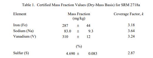 表 1 中提供了鐵、鈉、硫和釩的認證值,以基于干質(zhì)量的質(zhì)量分數(shù) [1] 表示。NIST 認證值是 NIST 具有最高的值對其準確性的信心,因為所有已知或可疑的偏差來源都已被調(diào)查或考慮 [2]。認證值是對真實值的當(dāng)前最佳估計。